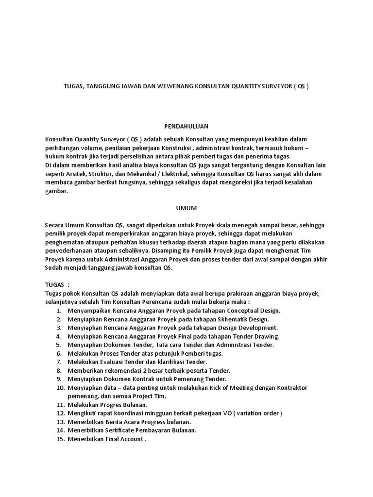 Tugas Quantity Surveyor - 1 - Dari lima fungsi utama tersebut, penulis ingin membahas lebih lanjut …. 22.01.2021 · materi quality control : Dari lima fungsi utama tersebut, penulis ingin membahas lebih lanjut … Ukuran kolom rumah 2 lantai dan besi yang dipakai. Melakukan plotting site plan di lokasi pekerjaan untuk menentukan benchmark, center line, titik elevasi tanah asli dari border line. 27.10.2021 · skop tugas kerani tapak.